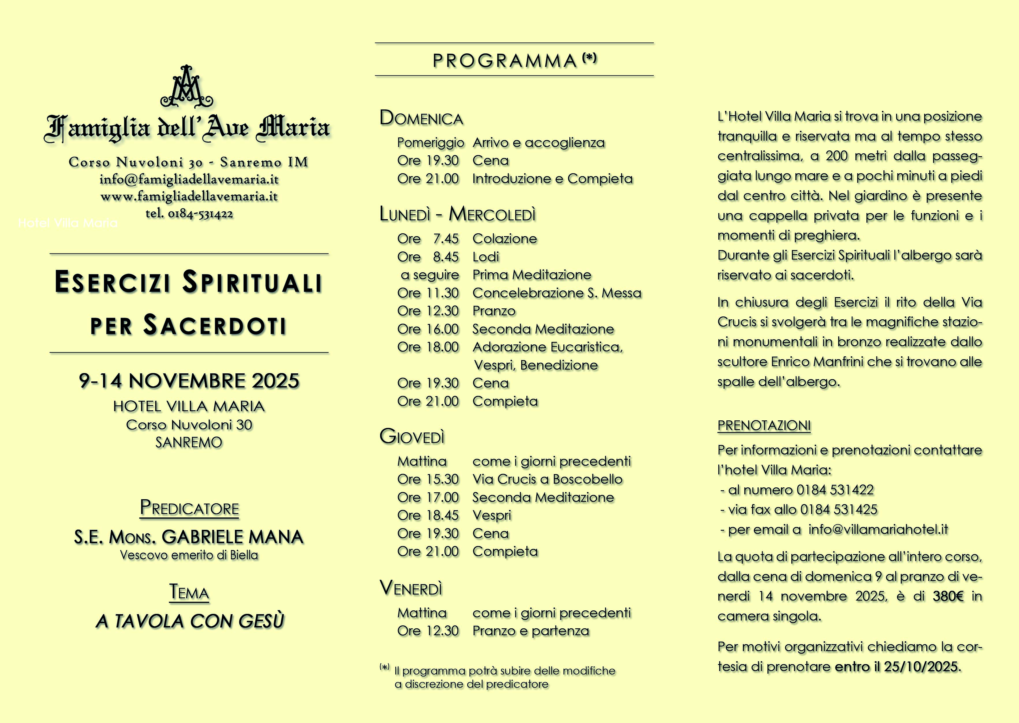 Durante il corso di Esercizi Spirituali l’albergo sarà riservato ai sacerdoti.